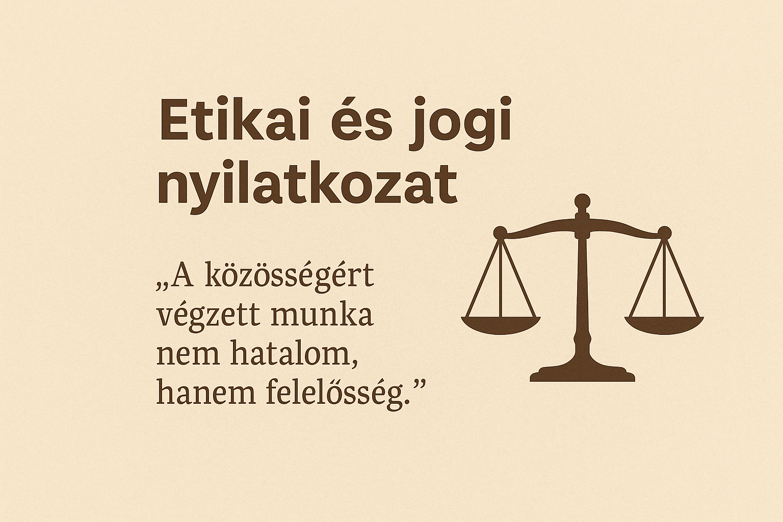 Minden kommunikációm és közösségi szerepvállalásom során a jóhiszeműség, a tisztesség és az emberek méltóságának tisztelete vezérel. Biztosítom, hogy a közéleti szerepvállalás ne sértse a személyiségi jogokat, ne tartalmazzon rágalmazást, hamis kijelentést vagy uszítást. (Lásd a 2013. évi V. törvény – Ptk., valamint a 2012. évi C. törvény – Btk. rendelkezéseit.)